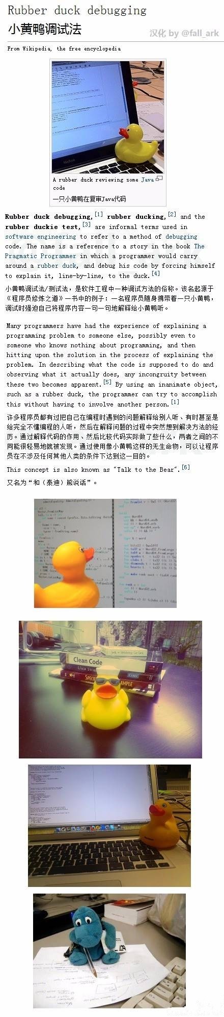 程序员是项很苦逼的职业,一个人很寂寞,有其他人呢又会觉得烦,因此也就应运产生了所谓的“小黄鸭调试法(Rubber duck debugging)”,就是在调试/纠错/测试过程中,耐心地向小黄鸭解释每一行程序的作用,以此来等待灵感的降临。